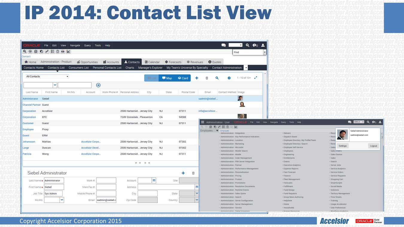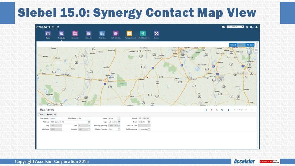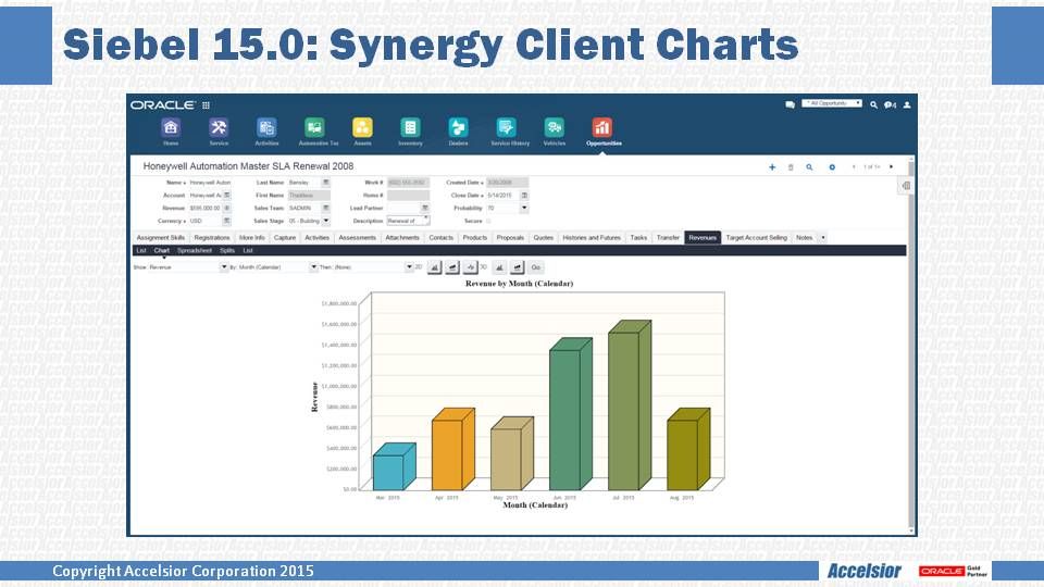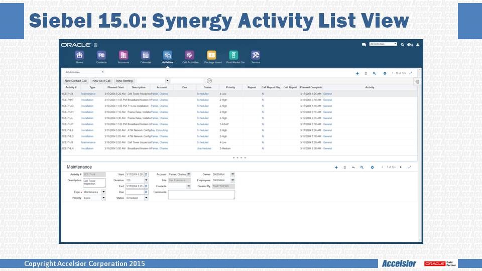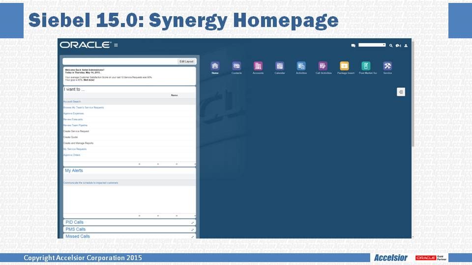 Siebel 15, aka Innovation Pack 2015, was released in May 2015 and includes a new theme called "Synergy". This theme is almost identical to the user interface in existing Oracle Cloud applications like Oracle Sales Cloud, and Oracle Service Cloud. The “Synergy” theme has a modern look and feel, and the “Screen Tiles” at the top of the page allow for easy navigation with touch screen devices.