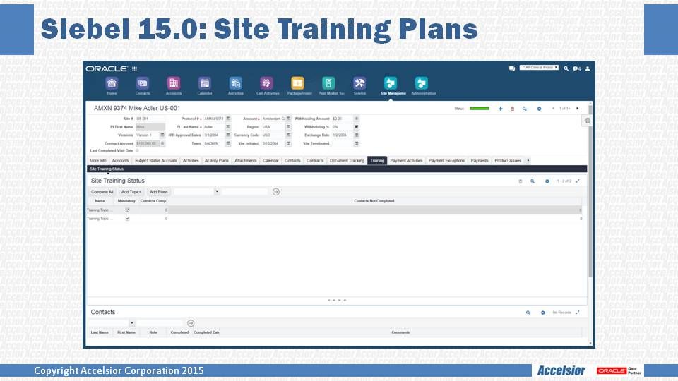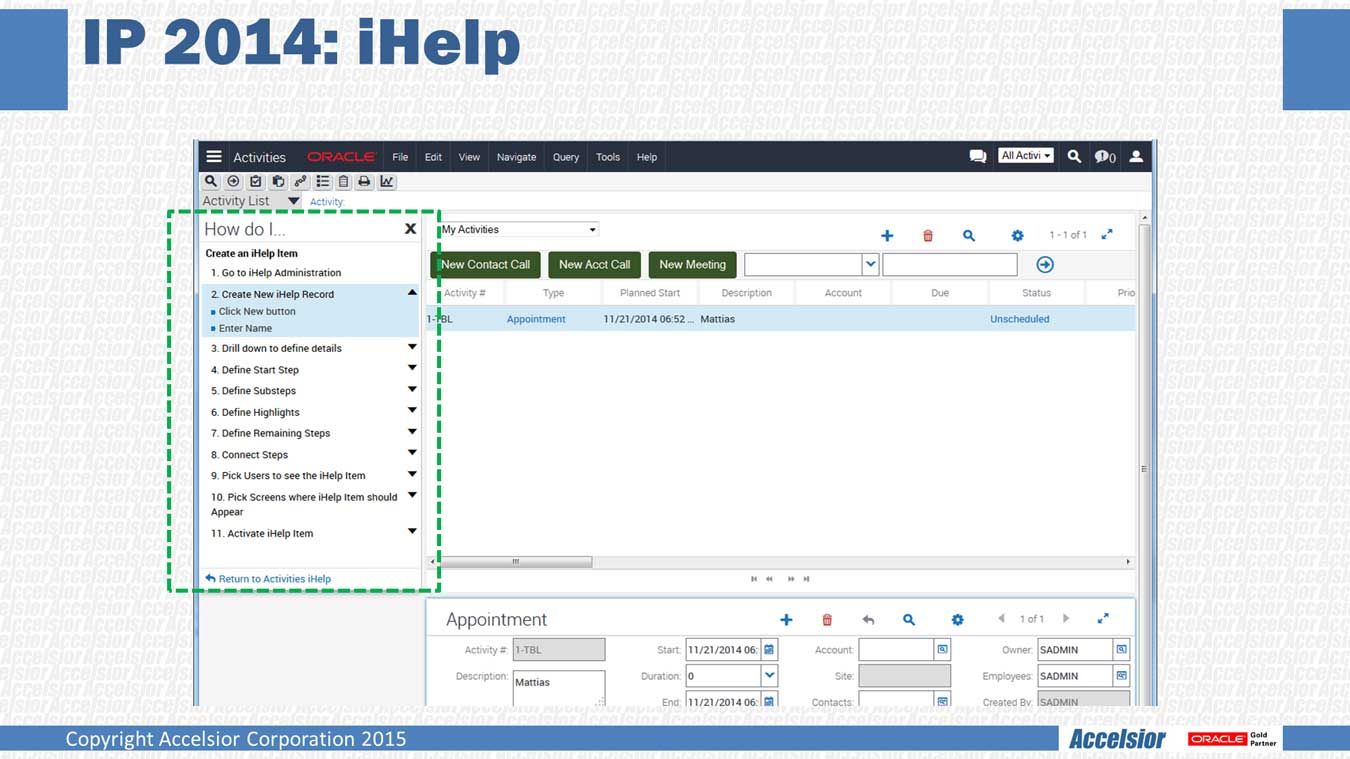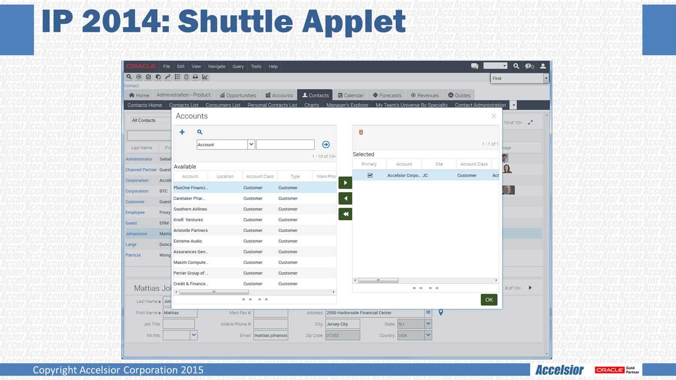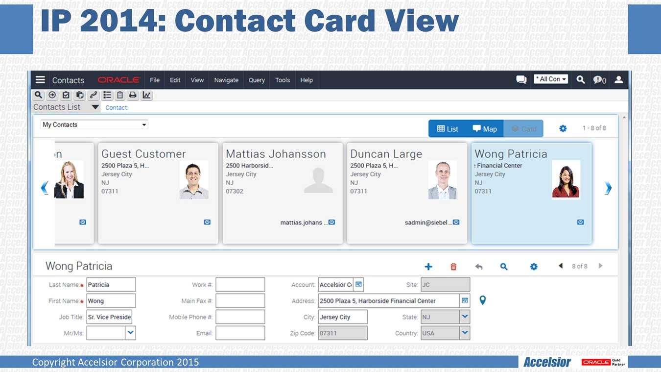 Siebel 15, aka Innovation Pack 2015, was released in May 2015 and includes a new theme called "Synergy". This theme is almost identical to the user interface in existing Oracle Cloud applications like Oracle Sales Cloud, and Oracle Service Cloud. The “Synergy” theme has a modern look and feel, and the “Screen Tiles” at the top of the page allow for easy navigation with touch screen devices.